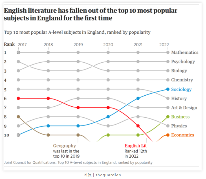前10名中的其他學科分別是歷史、藝術(shù)與設(shè)計、商業(yè)研究、物理和經(jīng)濟。