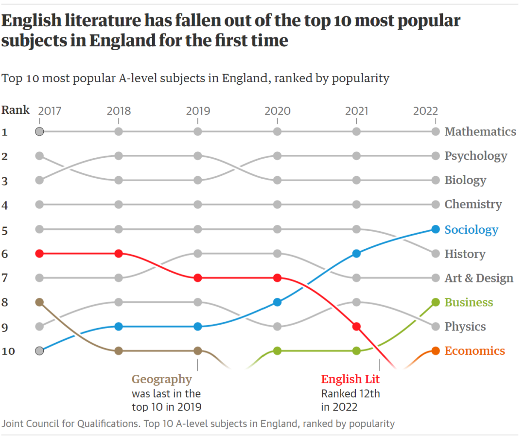 但是2022年有一條新聞值得我們注意10大最受歡迎A-Level科目呈現(xiàn)變化,英語文學(xué)跌出Top 10,經(jīng)濟(jì)學(xué)進(jìn)入前10(經(jīng)濟(jì)學(xué)在今年吸引35,000多名英格蘭學(xué)生)
