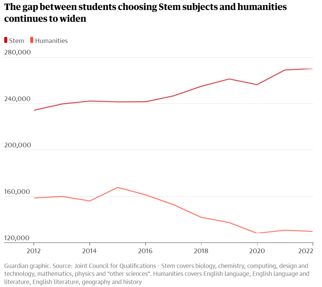 STEM科目(生物學(xué)、化學(xué)、計算機(jī)、設(shè)計和技術(shù)、數(shù)學(xué)、物理學(xué)和“其他科學(xué)”)受歡迎度直線上升,選擇人文學(xué)科的學(xué)生量減少。與2019年相比,選STEM科目的學(xué)生人數(shù)增加了3.5%,選擇人文學(xué)科(英語、地理和歷史)的人數(shù)同期下降了3.3%。