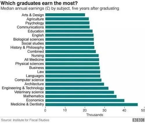 這就要看同學(xué)們未來想從事什么行業(yè),除了興趣,還要考慮到未來的發(fā)展和收入,根據(jù)英國財務(wù)研究所(IFS)的數(shù)據(jù)顯示,醫(yī)學(xué)、經(jīng)濟(jì)學(xué)、數(shù)學(xué),這三大專業(yè)以畢業(yè)生年收入比較高。