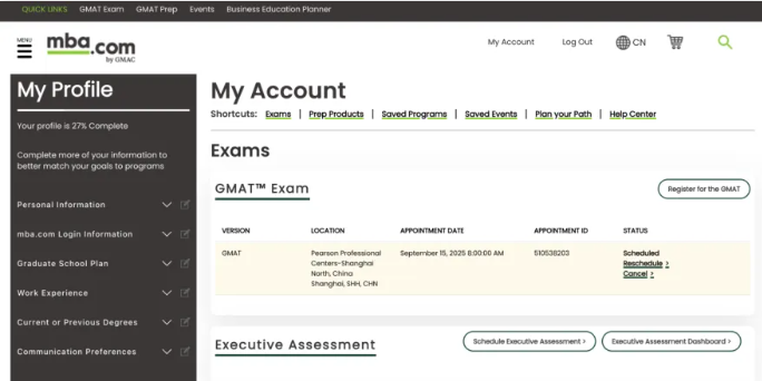 支付完成后,返回GMAT官網(wǎng)完成考試預(yù)約,在my account中查看且預(yù)約。